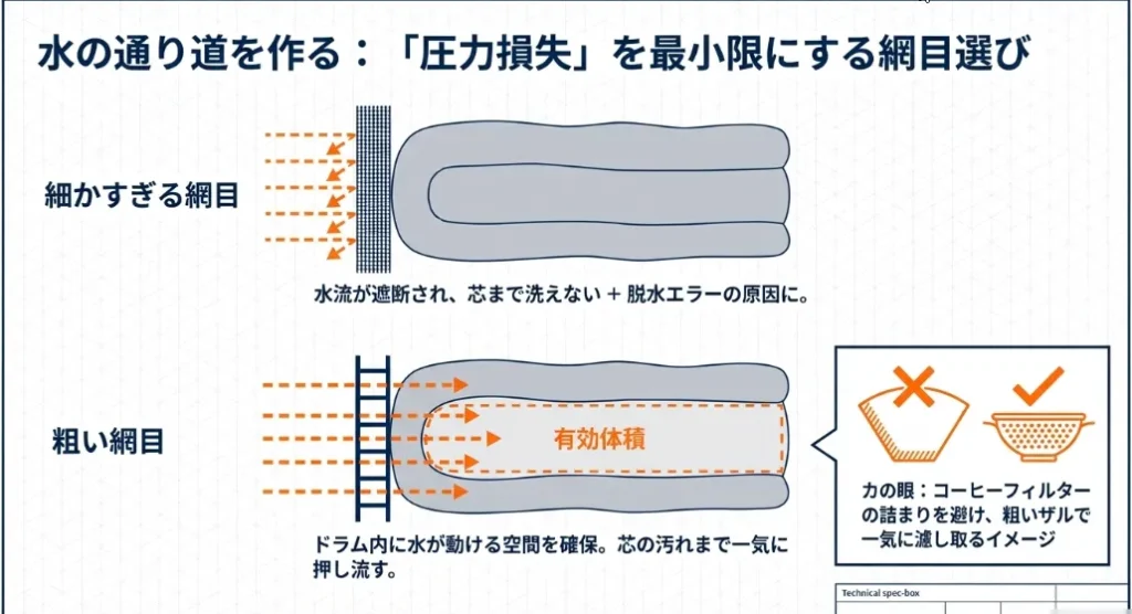 粗目メッシュが洗剤液を芯まで届ける「水流の通り道」