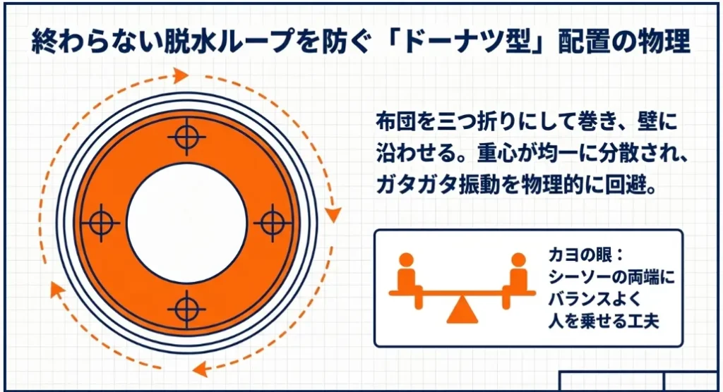 これが一番のポイント! 洗濯機に入れる際は、ドラムの壁に沿うように円を描いて配置してください。中心に空間(穴)を作ることで、脱水時の遠心力が均等にかかり、洗濯機がガタガタと止まる「脱水ループ」を防ぐことができます。