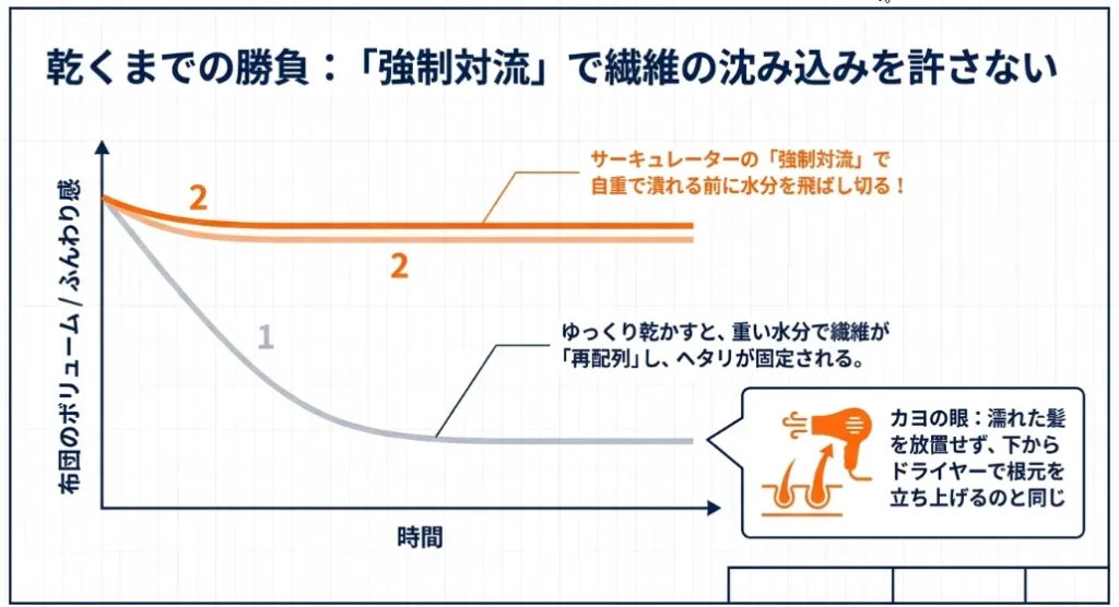 洗濯が終わって安心するのはまだ早いです。実は、布団の「へたり」は乾くまでの時間に決まります。水分を含んだ重みで繊維が潰れてしまう前に、いかに早く水分を飛ばすかが勝負なんです。