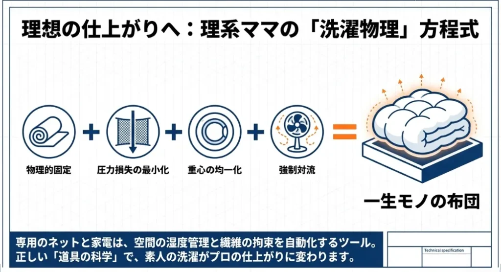 今回は、理系ママの視点から、布団の寿命を縮めずに「新品のような仕上がり」を実現するための、道具の科学についてお話ししますね。キーワードは「ドラムの中の空間マネジメント」です!