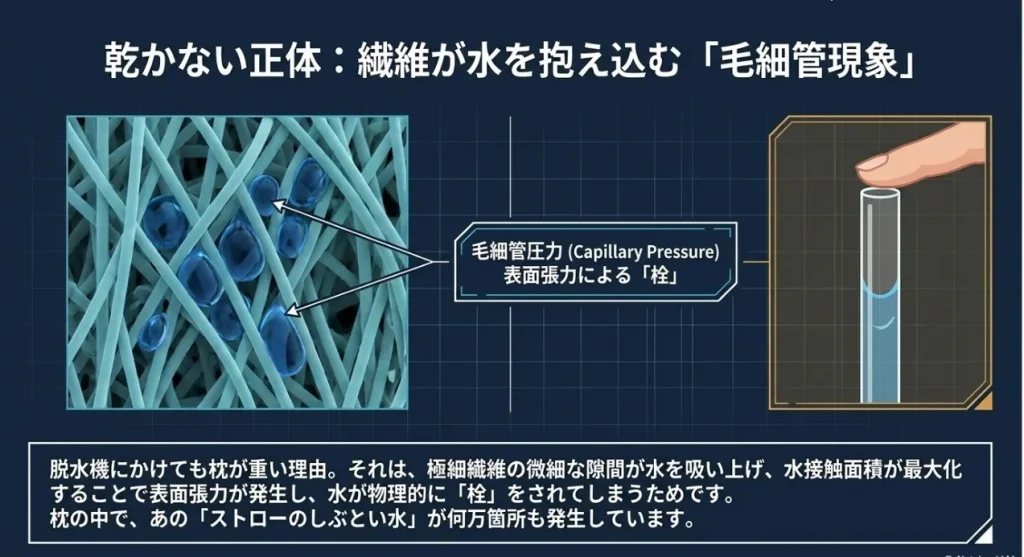 低反発枕に使われるウレタンは、細かい泡が集合したような構造をしています。ここに水が入ると、泡の出口を水が「栓」のように塞いでしまいます。これを「液封現象」といいます。一度出口が塞がると、中の水は蒸発したくても逃げ場がありません。だから「1週間干しても中心がジメジメしている」なんていう、カビの原因になる絶望的な状況が生まれるのです。