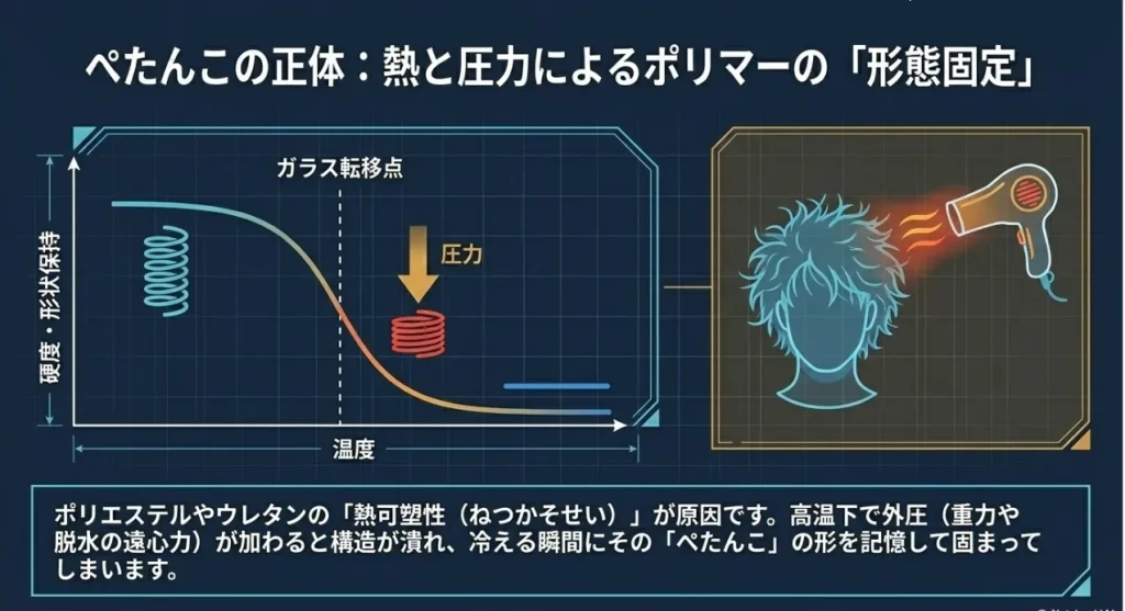 ポリエステル繊維は、ある一定の温度(ガラス転移点)を超えると、ふにゃふにゃに柔らかくなり、冷えるとその時の形で固まってしまう性質があります。水に濡れた状態だとこの温度が下がりやすく、乾燥機の熱風を直接浴びると、繊維がつぶれたまま「再結晶化」してしまいます。これが、二度と戻らないぺたんこ枕の正体です。乾燥機を使う場合も、必ず「低温設定」にするか、自然乾燥をメインにするのが理系ママの鉄則ですよ。