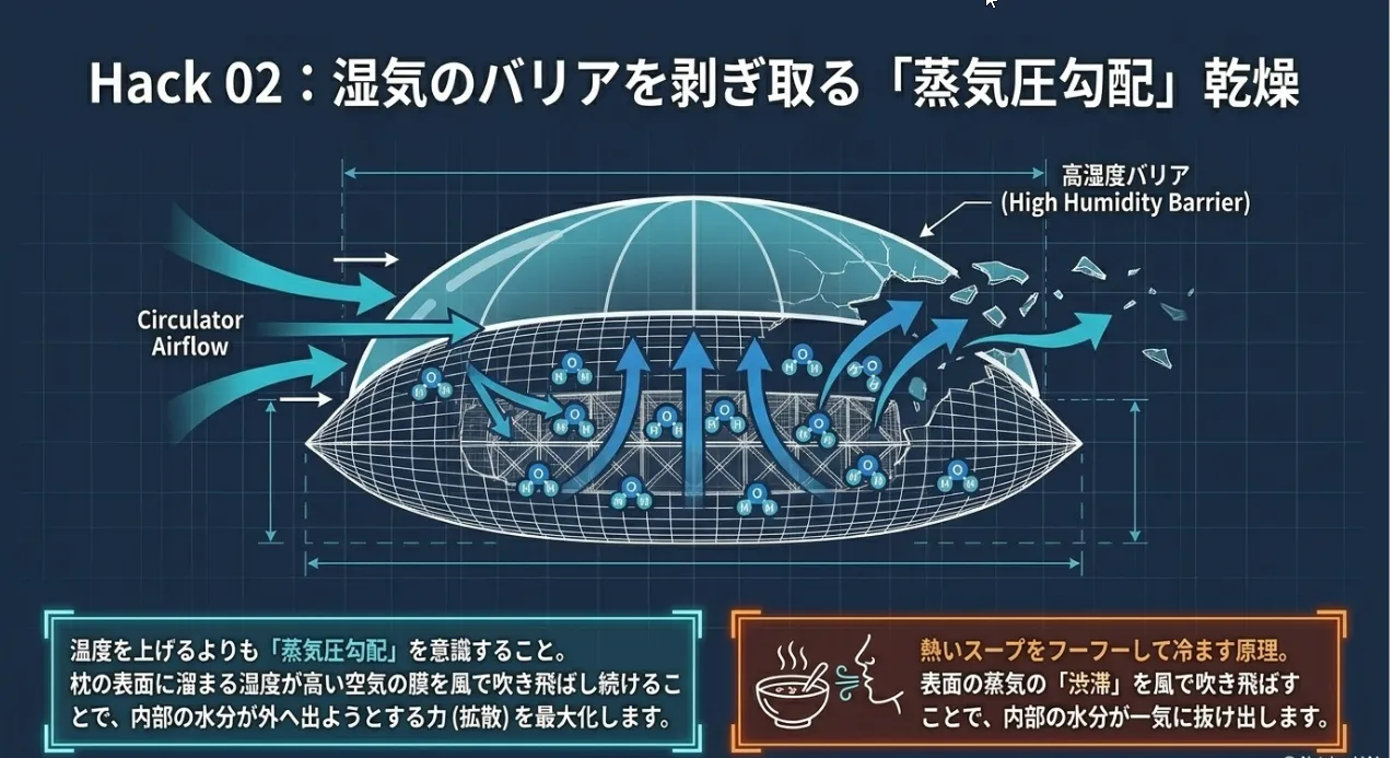 | 剥がす(乾燥) | [山善] サーキュレーター | 枕表面の湿度膜を剥ぎ取り、内部からの水蒸気拡散を劇的に早めます。 |