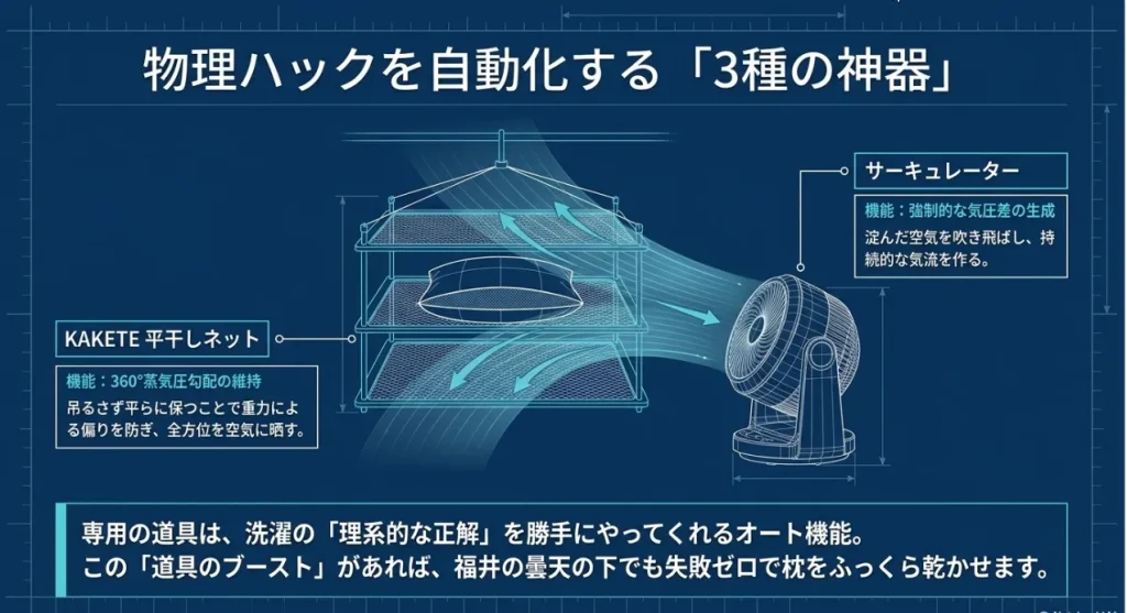 | 逃がす(干具) | KAKETE 物干しネット | 枕を浮かせることで全方位の通気性を確保し、水の停滞(液封)を防ぎます。 |