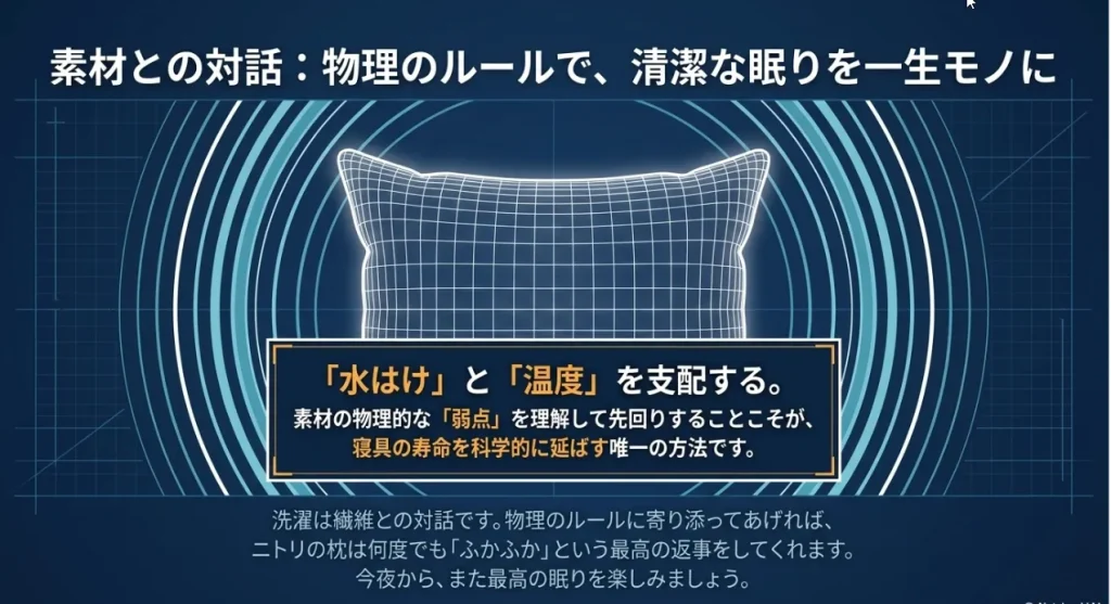 ニトリの枕は、私たちの眠りを支える素晴らしい相棒です。でも、その相棒は「水」と「熱」にはちょっぴり弱いということを忘れないでください。毛細管現象で水を抱き込み、熱可塑性で形を固めてしまう性質があるからこそ、私たちは論理的なアプローチで接してあげる必要があります。