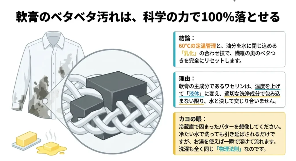 軟膏汚れは「60℃の湯」と「乳化」で100%落とせる