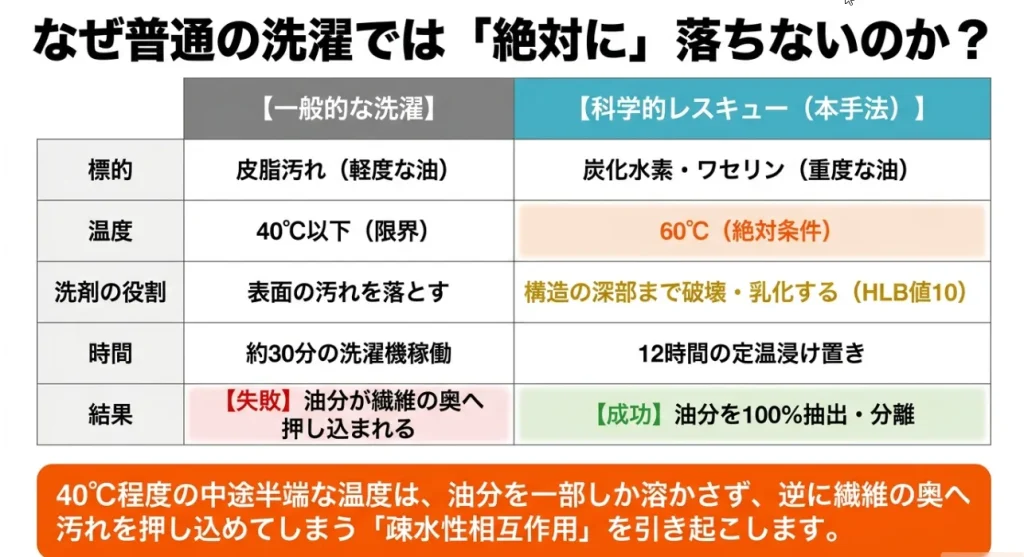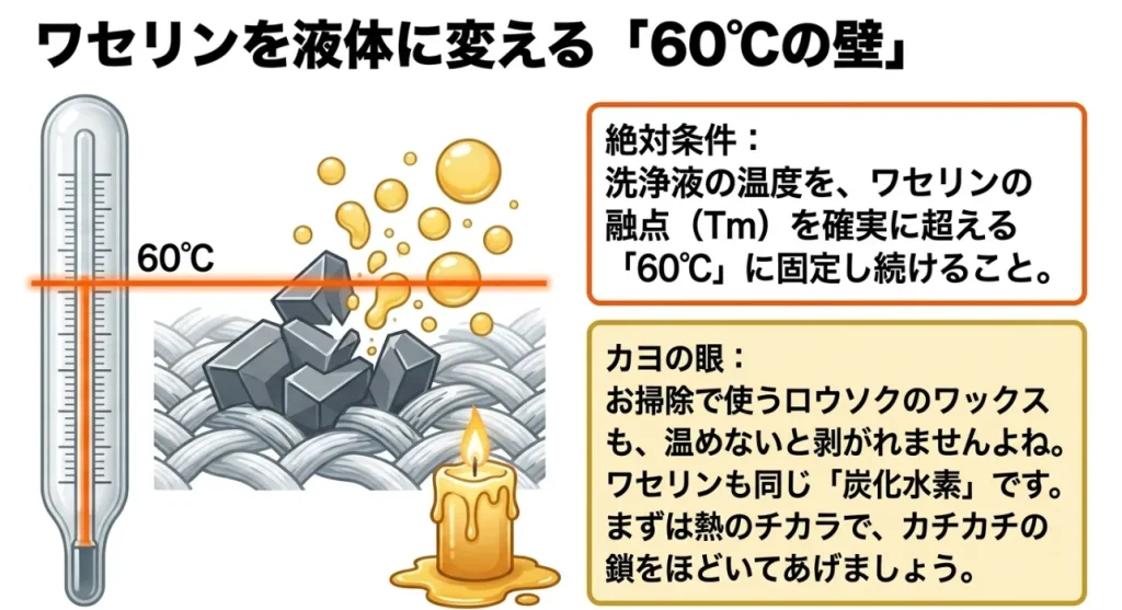 洗濯も全く同じ。軟膏汚れを落とす第一条件は、この融点を超えて、ワセリンを「サラサラのオイル」に変えることです。中途半端な40℃では一部しか溶けず、繊維の奥に残った「核」が汚れを繋ぎ止めてしまいます。だからこそ、私たちは「60℃」という高い温度をターゲットにする必要があります。