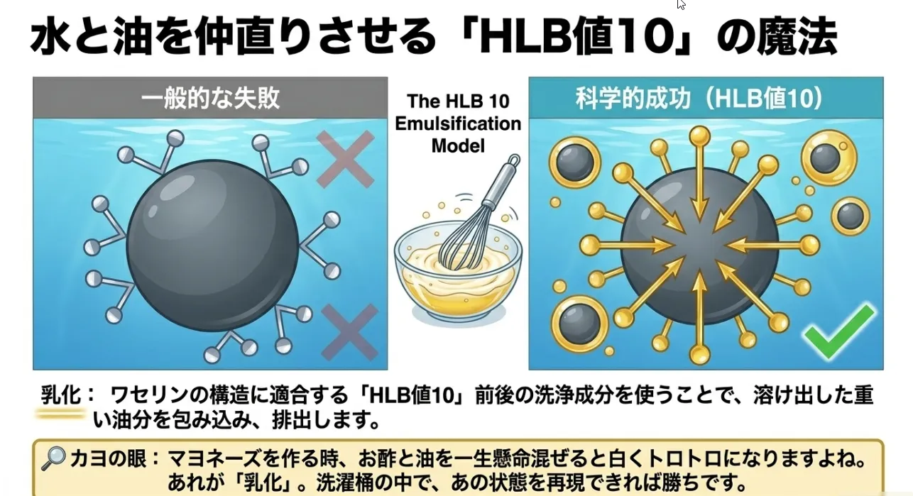 マヨネーズを作る時、酢と油を一生懸命混ぜると白くトロトロになりますよね。あれが「乳化」です。洗濯桶の中で、あの状態を再現できれば勝ち! 繊維の中から油が溶け出して、お湯が白く濁ってくるのを見ると「よし、アンカーが抜けた!」ってガッツポーズしちゃいます。