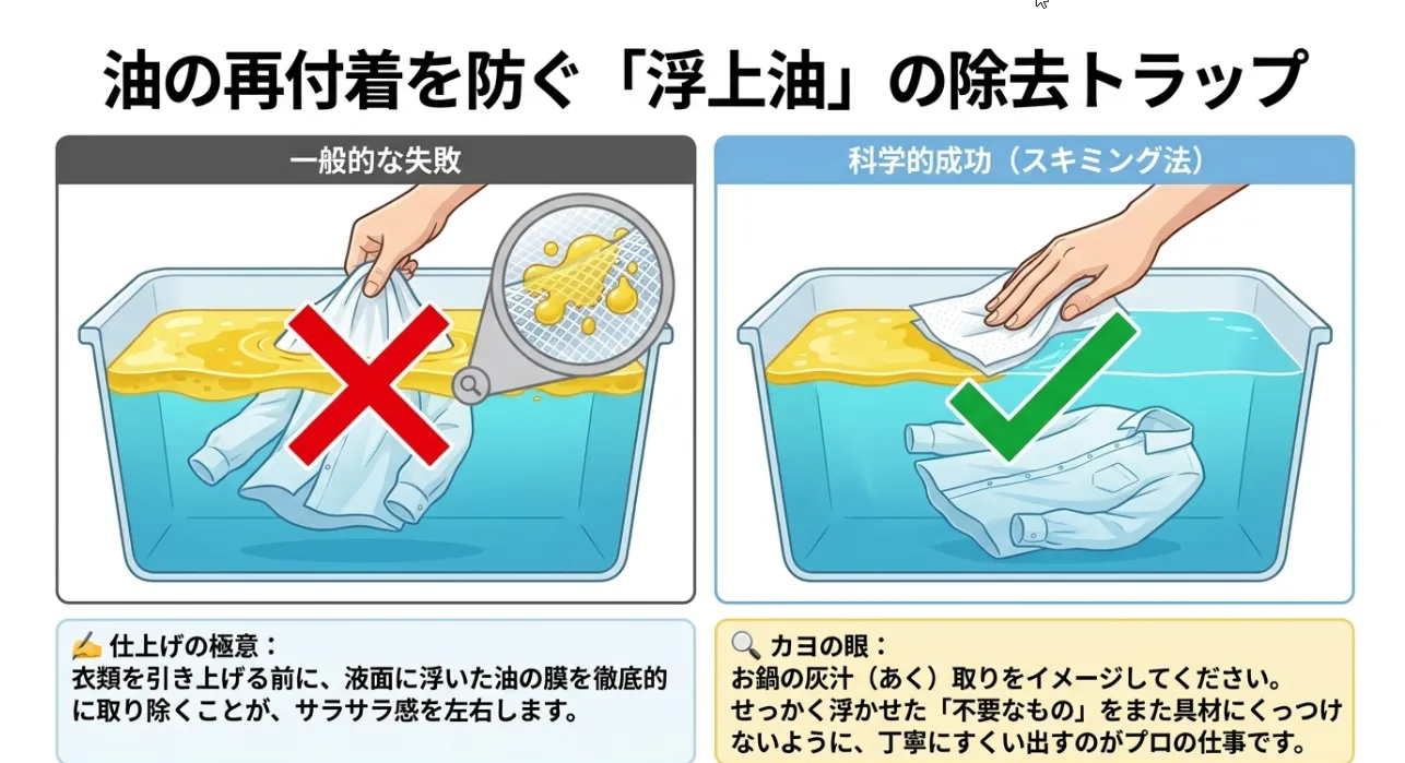 - 管理の力:衣類を引き上げる瞬間まで、油分を浮かせたまま再付着を阻止する。