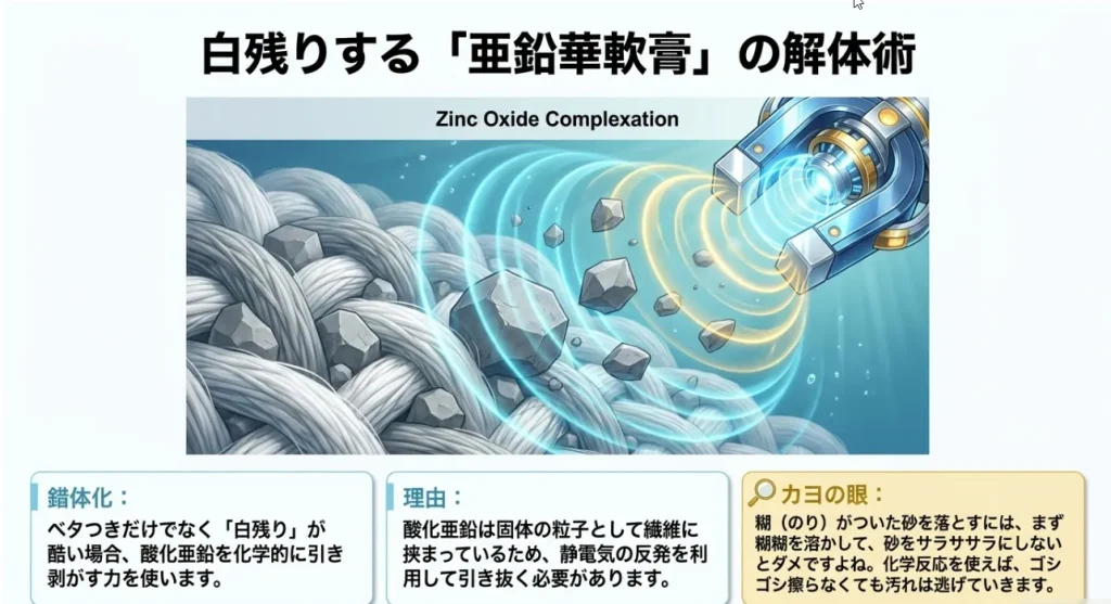 ワセリン主体の軟膏なら温度と洗剤で解決しますが、厄介なのが「亜鉛華軟膏」のように白い粉末状の成分(酸化亜鉛)が含まれている場合です。油を落とした後でも、白い汚れが繊維の隙間に物理的に挟まって、ゴワゴワした感触が残ってしまうことがありますよね。