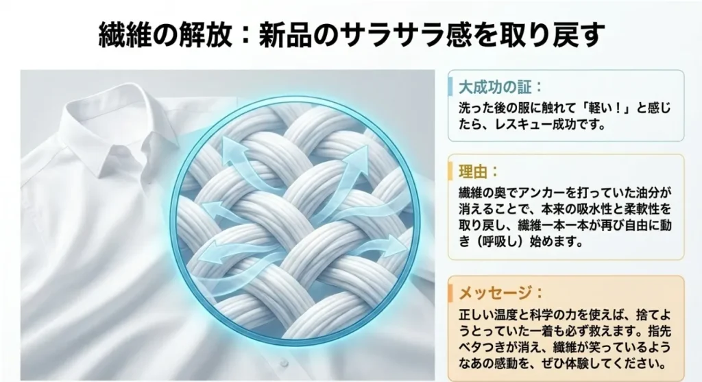 洗濯が終わって乾いた後の衣類に触れてみてください。指先に残っていたヌルヌルが消え、繊維の間に空気が通って、本来のふわふわ感が戻っているはずです。その時、あなたの手にあるのは単なる「洗った服」ではなく、知識と工夫で守り抜いた「大切な一着」そのものです。