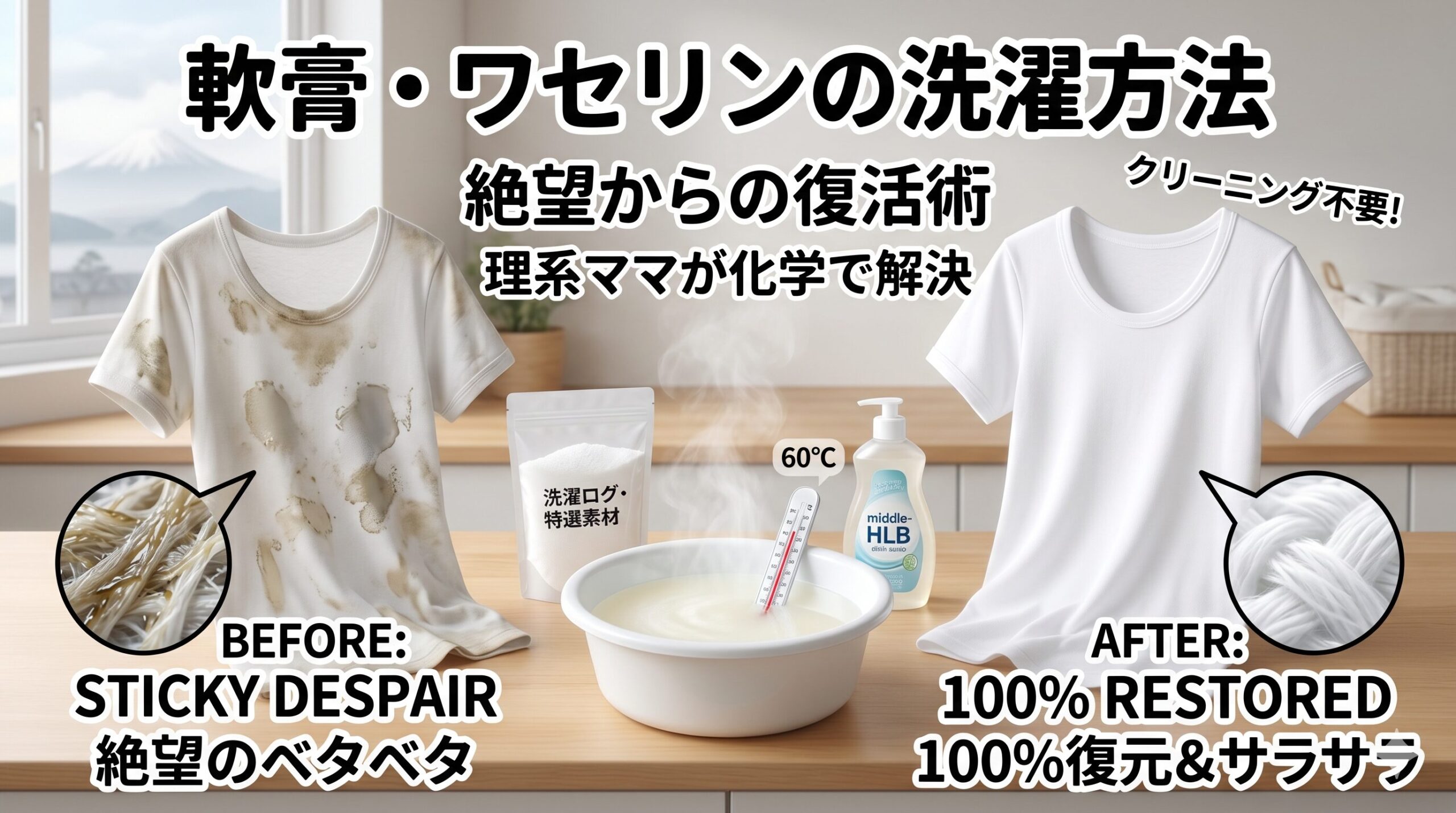 皮膚を守るための軟膏やワセリン。でも、一度衣類についてしまうと、普通の洗濯ではビクともしない「最強の難敵」に変わってしまいますよね。私も以前、子供の保湿用ワセリンがついた肌着をいつものように洗ってしまい、他の洗濯物までヌルヌルが移って絶望したことがあります。