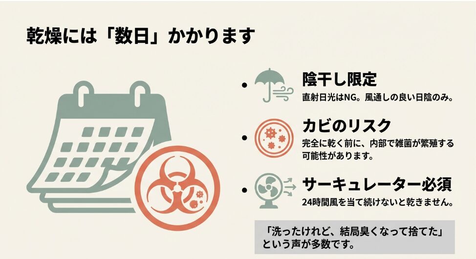 内部のカビ・異臭 水分残留・乾燥不足 ビーズ間隙での菌繁殖 高(完全乾燥が必要)