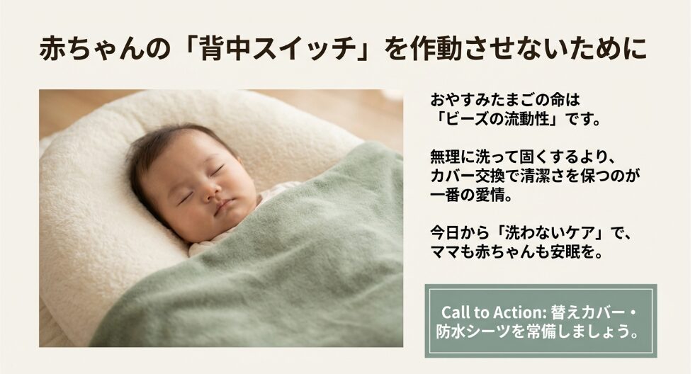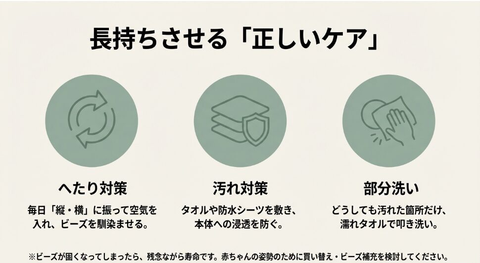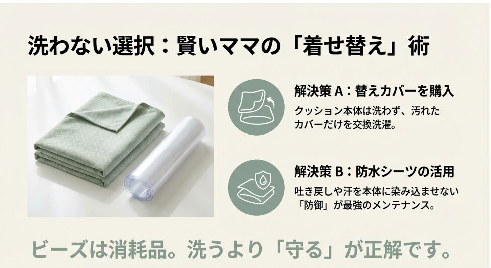 ビーズのへたりは物理的な寿命ですが、補充用ビーズで新品の「魔法のCカーブ」を復活させることができます。また、1枚の防水シーツが、将来の数時間に及ぶ洗濯レスキューの手間と、カビのリスクを9割カットしてくれます。