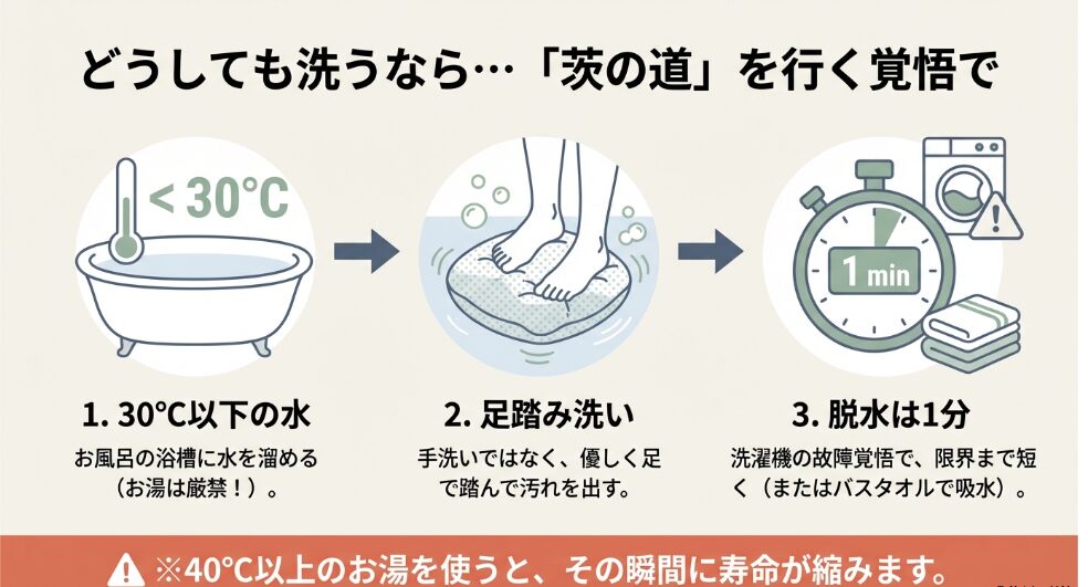 万が一クッションが破裂した場合、微細なビーズが排水パイプを詰まらせ、数十万円する洗濯機の修理が必要になることもあります。だからこそ、特大ネットの使用と「揉まない」洗浄が必須なんです。