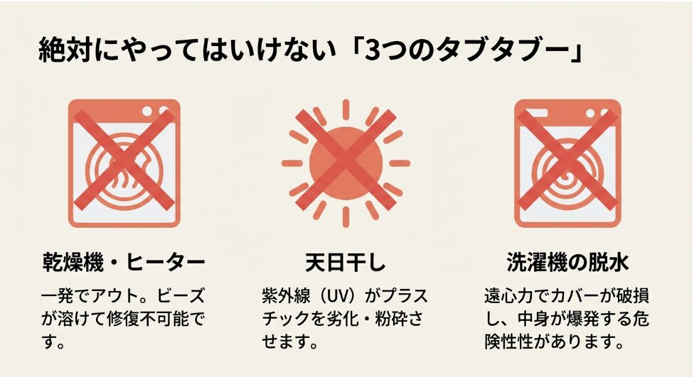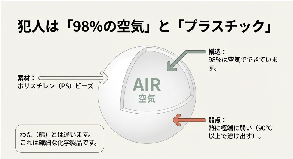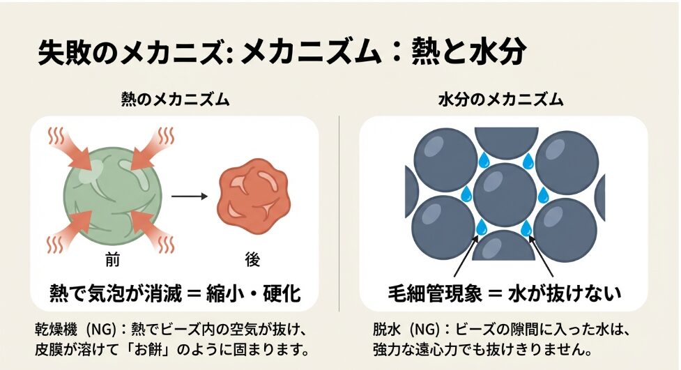 まず、内部に水が浸入すると、数百万個のビーズの隙間で「毛細管現象」が発生します。これが一度起きると、洗濯機の脱水(遠心分離)だけでは水分を弾き飛ばすことができず、中心部に水が残留し続けます。これが「乾かない=カビ・異臭」の根本原因です。また、乾かそうとしてドライヤーの熱風を当てると、樹脂の熱可塑性によりビーズが溶着し、ふわふわの質感が失われて「岩」のように硬化してしまいます。これが一度起きると修復は不可能です。