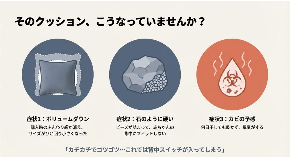 ビーズのへたりは物理的な寿命ですが、補充用ビーズで新品の「魔法のCカーブ」を復活させることができます。また、1枚の防水シーツが、将来の数時間に及ぶ洗濯レスキューの手間と、カビのリスクを9割カットしてくれます。