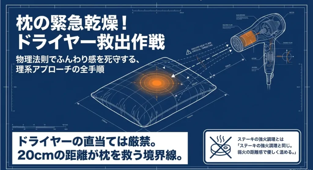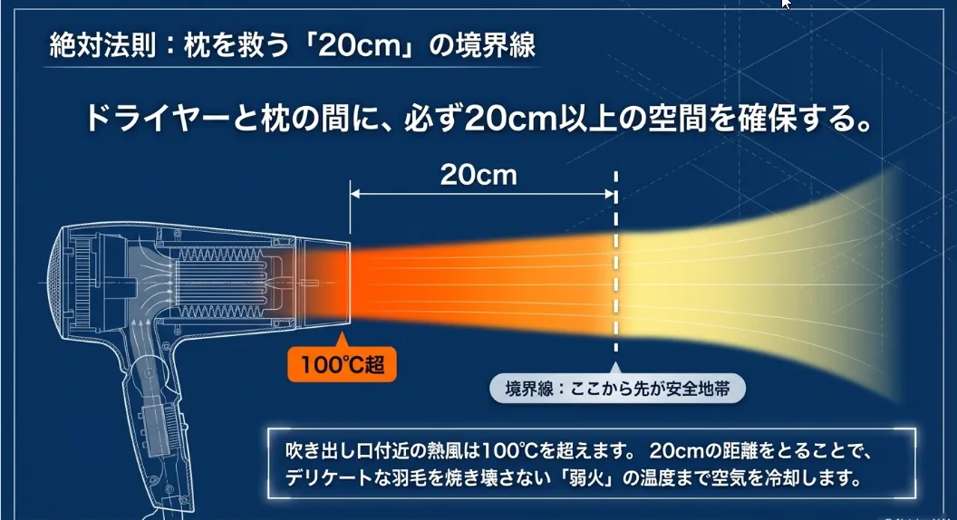 ドライヤー直当て厳禁!20cmの距離が枕を救う境界線