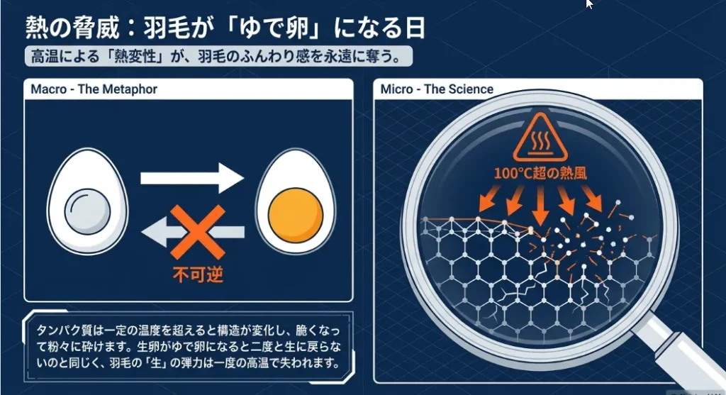 熱風で羽毛が「ゆで卵」に?タンパク質変性が招くボロボロ化