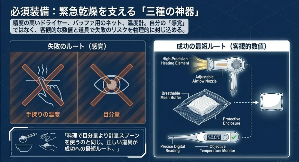 今回は、どうしても今すぐ乾かしたい時のための「科学的な救出プロトコル」をお伝えします。物理的な限界を守りながら、安全に、そして最短で安眠を取り戻す方法を一緒に見ていきましょう。