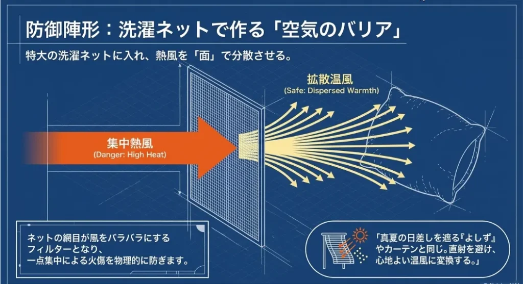 ネットと枕の間にできるわずかな「空気の層」がクッションとなり、熱が一点に集中するのを防いでくれます。これにより、生地へのダメージを最小限に抑えつつ、広い範囲に温風を届けることが可能になるんです。