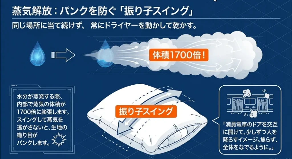 ドライヤーを固定して当てるのは絶対にNGです。枕の内部では、熱によって温められた水分が「蒸気」へと変わっています。同じ場所に当て続けると、逃げ場を失った蒸気が生地の織り目を押し広げ、側生地を傷めてしまう原因になります。これを防ぐのが、手首を柔らかく使った「振り子照射法」です。
