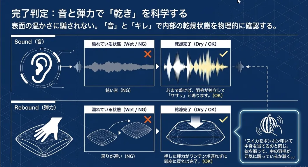 表面が温かくなると乾いた気がしちゃうけど、実は中身は蒸れ蒸れ…なんてことも。理系ママ流のチェック法で、中の羽毛が「元気に踊っているか」を確認しましょう。ここをサボると、明日の朝には生乾き臭の地獄が待っていますよ!