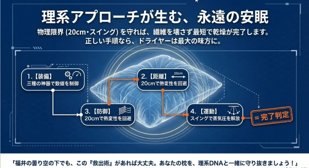 枕が乾かない焦りからくる「ドライヤー直当て」は、大切な一生モノの枕を壊してしまう行為です。でも、今回お伝えした「20cmの距離」と「ネットによる拡散」、そして「蒸気を逃がす振り子法」を徹底すれば、それは立派な救出作戦になります。