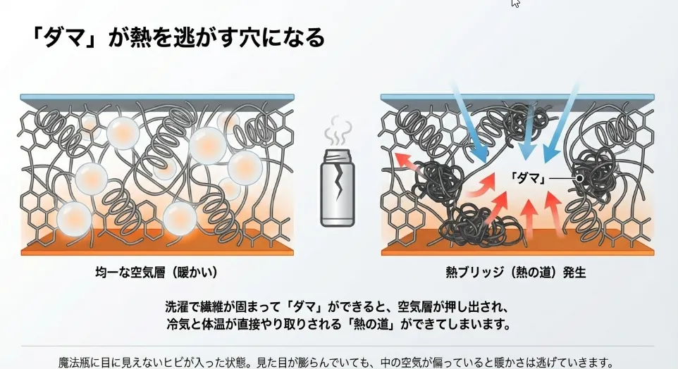 しかし、洗濯などで水分を含んだ中綿が乾燥する際、水の表面張力によって繊維同士が引き寄せられ、小さな塊(ダマ)になってしまうことがあります。繊維が固まると、それまで空気が占めていたスペースが潰れ、代わりに熱を通しやすい「繊維の道(熱ブリッジ)」ができてしまいます。これが、見た目はふんわり戻っているのに、袖を通すとスースー寒く感じる物理的な理由です。