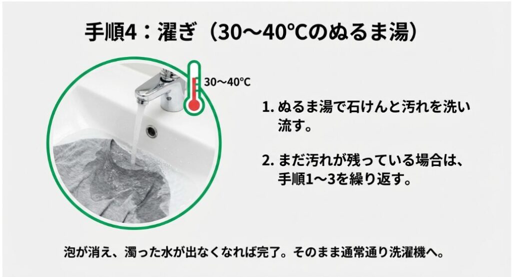 4. ぬるま湯ですすぎ、洗濯機へ