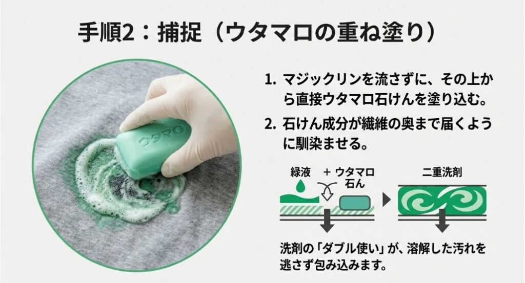 マジックリンが馴染んだら、その上からウタマロ石けんを裏側から塗り込みます。水はまだつけないでください。高濃度の石けん分が、メッシュに詰まった粒子の周りをコーティングしてくれます。