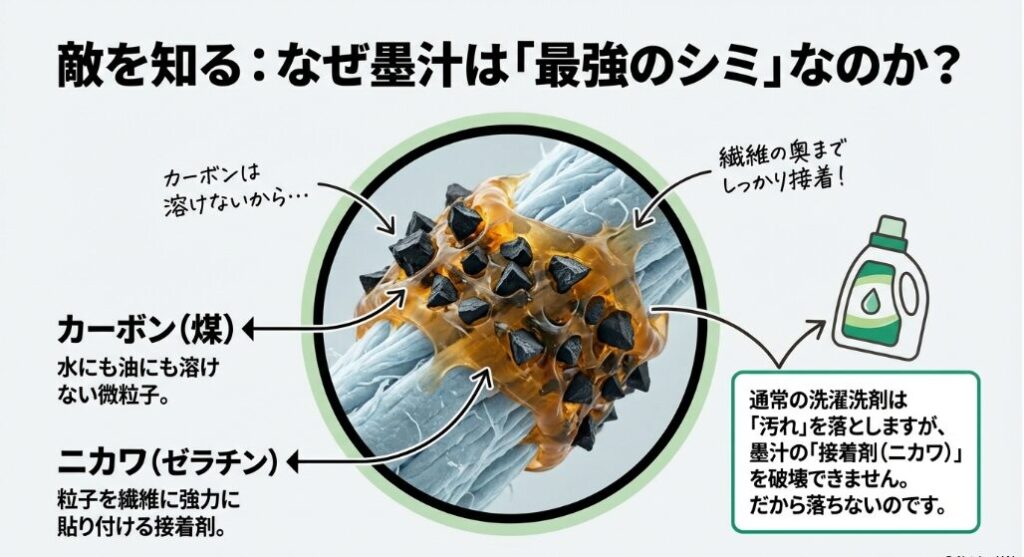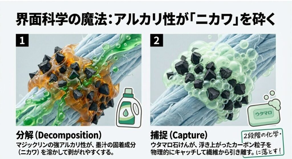 墨を迷路の奥で固めているのは「膠(にかわ)」というタンパク質の接着剤。これを壊すには、通常の洗剤では歯が立ちません。キッチン用マジックリンの「強アルカリ」が、このボンドを分解してくれます。
