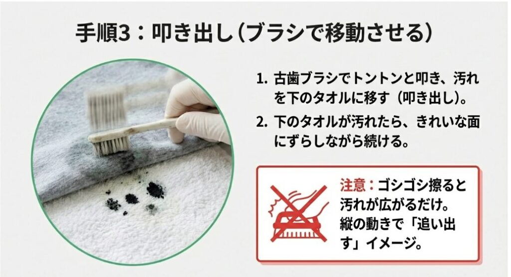 ジャージの裏側から垂直にトントンと叩き続けます。網目を抜けて、下のタオルに黒い色が移っていくのを確認してください。絶対に横に擦ってはいけません。