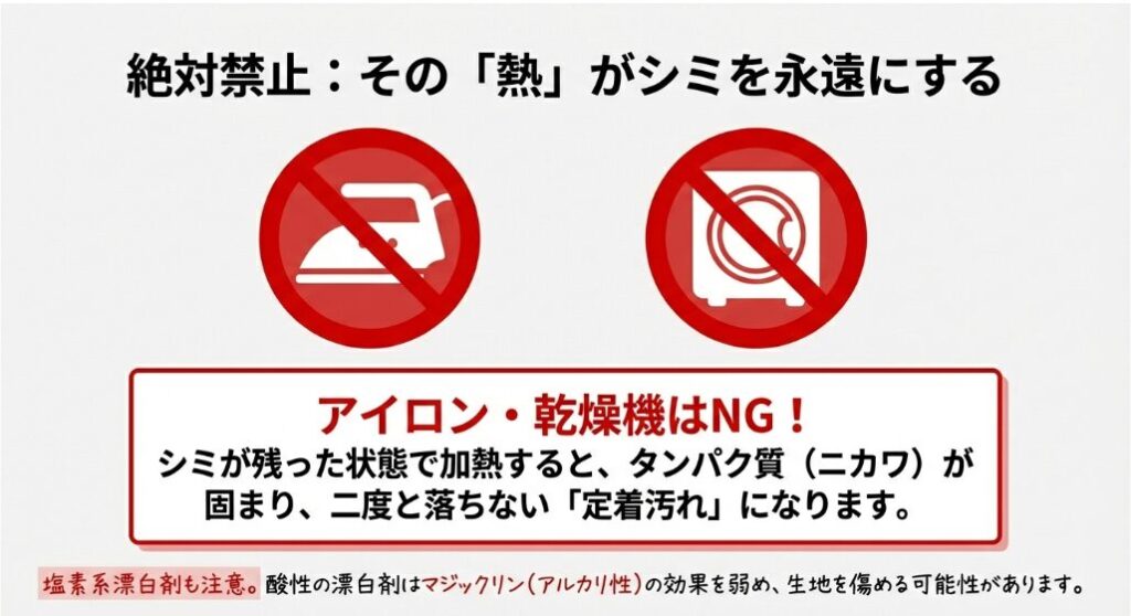 最後に、これだけは絶対にやらないでほしい「二次被害」をお伝えします。それは、**「シミが完全に消えていない状態でのアイロン・乾燥機」**です。