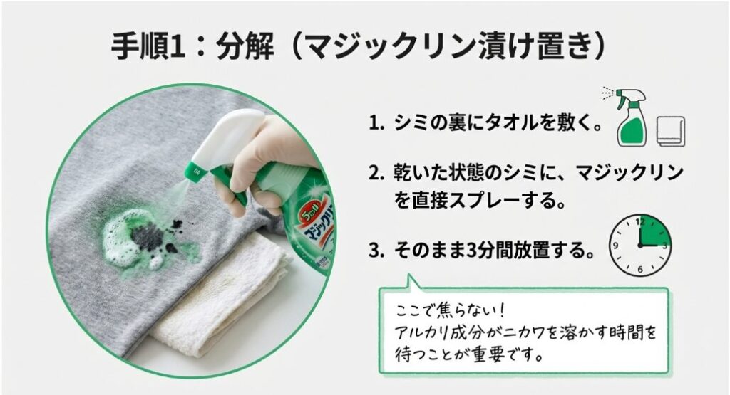 シミの**「表側」**に汚れてもいい厚手のタオルを当てます。そして、ジャージを裏返して**「裏側」**からマジックリンを直接吹きかけます。特に薄手の半袖ジャージは、裏からの方が粒子が抜けやすい構造になっています。そのまま3分間、ボンド(膠)が溶けるのを待ちましょう。