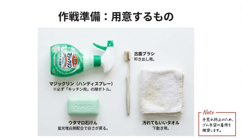 ジャージの生地は、表から叩いても迷路の奥に押し込むだけ。特に白い半袖は、裏側から攻めるのが鉄則です。「マジックリンでボンドを溶かし、ウタマロで滑らせ、裏から叩き出す」。この科学的な手順こそが、毛玉を作らずに真っ白に戻すための正解なんです。
