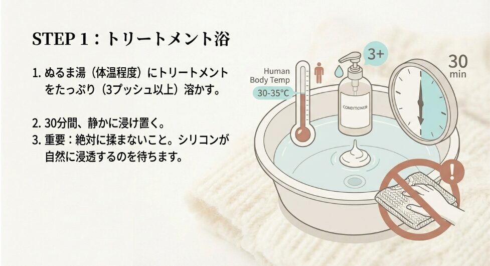 まず、洗面ボウルに30℃のぬるま湯を張ります。ここに「プロ・ウォッシュ」を通常の1.5倍の濃度で溶かしてください。縮んだニットを静かに沈め、30分間そのまま浸け置きします。この間、絶対に揉んではいけません。潤滑成分がウロコの隙間にナノレベルで浸透していくのをじっと待ちます。