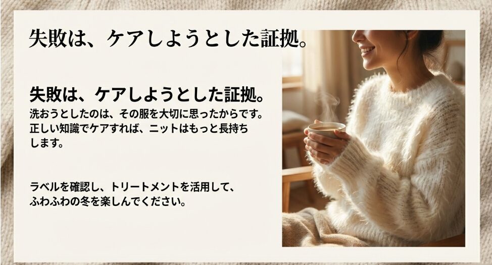 「なんであんな洗い方しちゃったんだろう」と自分を責めないでくださいね。洗濯で失敗するのは、それだけあなたが一生懸命に家事をこなしている証拠です。今回のリカバリーを通じて、今まで以上にその一着が愛おしく感じられるはず。ふっくら蘇ったニットに袖を通したとき、その温かさがあなたの頑張りを包み込んでくれるはずですよ。一緒にお洗濯、頑張りましょうね!
