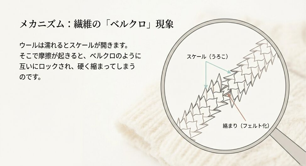 - 失敗の正体:天然繊維の「スケール(鱗片)」が噛み合うフェルト化のメカニズム