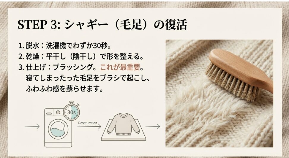 シャギーニットは、動くたびに毛先同士が摩擦で絡まろうとします。脱いだ直後に、天然の豚毛ブラシで優しくブラッシングしてあげてください。まずは毛並みに逆らって下から上へホコリを出し、次に上から下へ整える。これだけで、次回の洗濯時の「フェルト化リスク」を半分以下に減らせます。