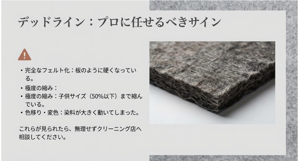 最後に、とても大切なお話をします。衣類レスキューとして、私は「何でも直せる」と無責任に言うことはできません。科学的に見て、家庭での修復を諦め、プロに託すべき「境界線」が存在します。