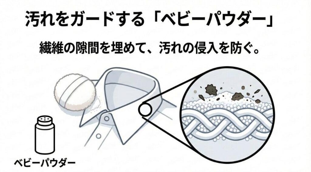 仕組みはとてもシンプルです。ベビーパウダーの微細な粒子が、あらかじめ繊維の隙間を埋めてくれます。いわば「身代わり」のバリアです。日焼け止めや汗がやってきても、直接生地に触れる前にこのパウダーが吸収してくれるため、汚れが定着しにくくなります。
