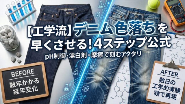 デニムの色落ちを早くさせる方法を理系ママが徹底解説!pH制御や酸化反応、物理的衝撃を同期させれば、数年かかるエイジングも数日に短縮可能です。デニムを早く色落ちさせる具体的な手順と必須アイテムを紹介。失敗を恐れず論理的に攻めて、理想のヴィンテージ感をその手に取り戻しましょう。