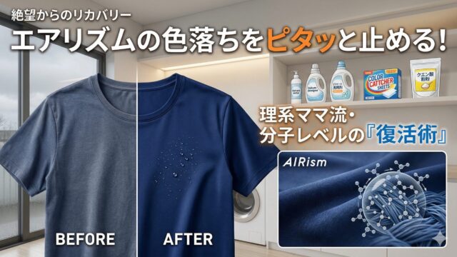 エアリズムの色落ちに絶望していませんか?実はポリエステルとキュプラの分子構造が原因です。理系ママが、pHコントロールや低温洗浄といった化学的アプローチで、エアリズムの色落ちを止める具体的な方法を解説。クエン酸や専用シートで、お気に入りの一着を新品の質感のまま救い出しましょう!