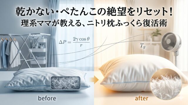 ニトリ枕の洗濯方法で悩んでいませんか?「乾かない」「ぺたんこ」の正体は中材の物理的な変質です。この記事では理系ママが、ウレタンやポリエステルの特性に基づいた正しい洗い方と、失敗を防ぐ乾燥のコツを科学的に解説します。素材を壊さないニトリ枕の洗濯方法で、清潔でふっくらした眠りを取り戻しましょう。