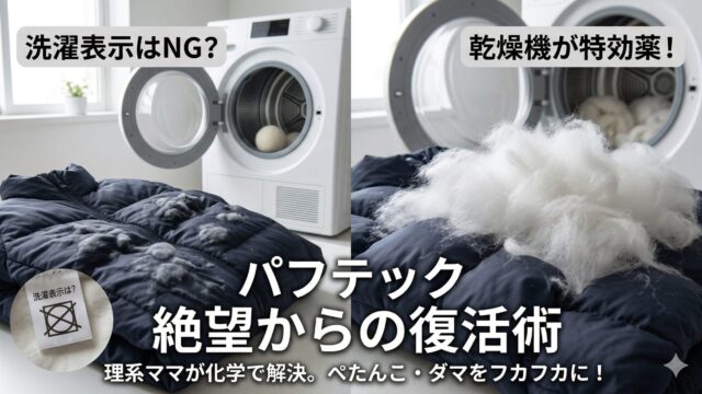 素材別・失敗しない「正しい洗い方」 パフテックは乾燥機で復活!ダマ・ぺたんこを直す理系ママの復元術 パフテックを洗濯してダマやぺたんこに絶望していませんか?実は、パフテックは乾燥機で正しくケアすれば新品同様に復活します。理系ママが繊維の「ガラス転移点」と「叩き効果」を科学的に解析。失敗のリスクを抑え、乾燥機でボリュームを取り戻す具体的な手順と必須アイテムを徹底解説します。 2026.03.24 素材別・失敗しない「正しい洗い方」