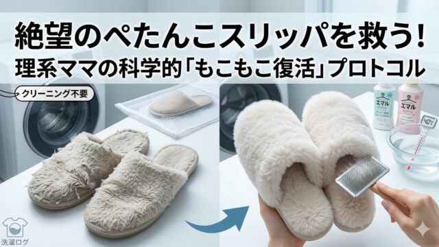 衣類・布製品の【洗濯失敗】復活術 もこもこスリッパの洗い方!ぺたんこ毛並みを救う科学的復元プロトコル スリッパの洗い方でもこもこを復活させたい方必見。理系ママのカヨが、潰れたポリエステル繊維を根元から立ち上げる科学的な洗浄プロトコルを伝授します。40度の温度管理とブラッシングの極意を知れば、ぺたんこのスリッパも新品同様に蘇ります。正しい洗い方でもこもこの至福をもう一度楽しみませんか? 2026.03.13 衣類・布製品の【洗濯失敗】復活術