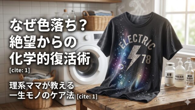 衣類・布製品の【洗濯失敗】復活術 ヴィンテージTシャツの色落ち対策!理系ママが教える硫化染料の保護術 ヴィンテージTシャツの色落ちや経年変化にお悩みではありませんか?理系ママのカヨが、硫化染料が硫酸を生む仕組みやプリントの脆化を科学的に解説。重曹での中和や洗剤選びなど、ヴィンテージTシャツの色落ちを最小限に抑える具体的な救済策を伝授します。大切な一着を一生モノに変えましょう! 2026.04.17 衣類・布製品の【洗濯失敗】復活術