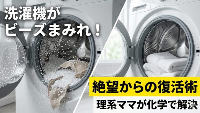 ビーズクッションを洗濯して破れた!と絶望中のあなたへ。洗濯機内に流出したビーズは静電気で固着し、水洗いでは取れません 。理系ママが柔軟剤で電荷を中和する科学的な回収術を伝授。ビーズクッションの洗濯で破れたトラブルを最速解決し、洗濯機の故障や爆発リスクを回避する手順を詳しく解説します。