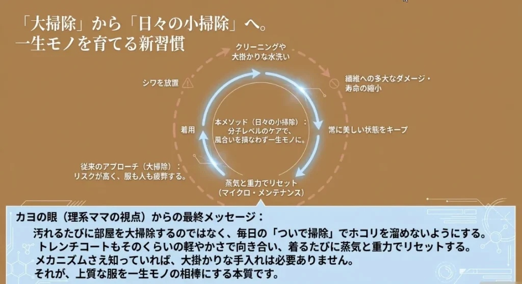 「この一着をずっと大切にしたい」。その願いは、ほんの少しの科学的な知識で叶えられます。シワが伸びてピシッとしたコートを羽織れば、明日のお出かけがもっと楽しみになるはずです。大切な一着、一緒に救い出して、長く楽しみましょうね!
